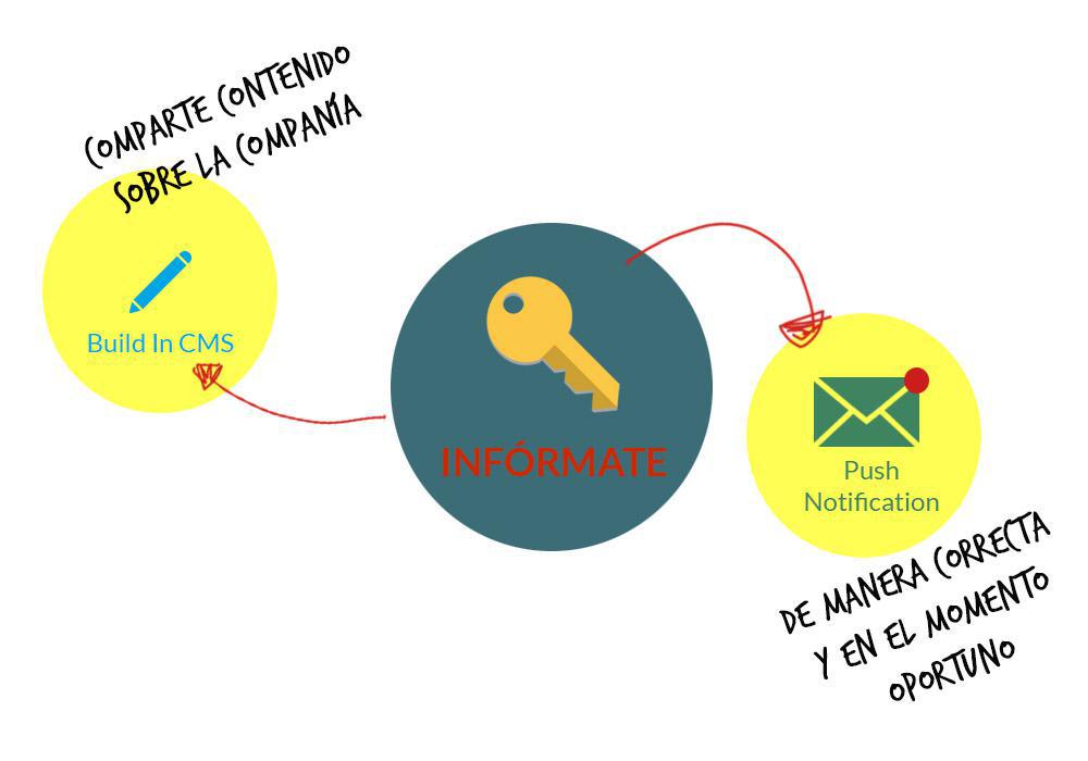 - Notificaciones push: son la herramienta perfecta para estar permanentemente en contacto con los empleados y para comunicarse con ellos mediante mensajes, tanto específicos como automatizados, sobre eventos y novedades de la firma.