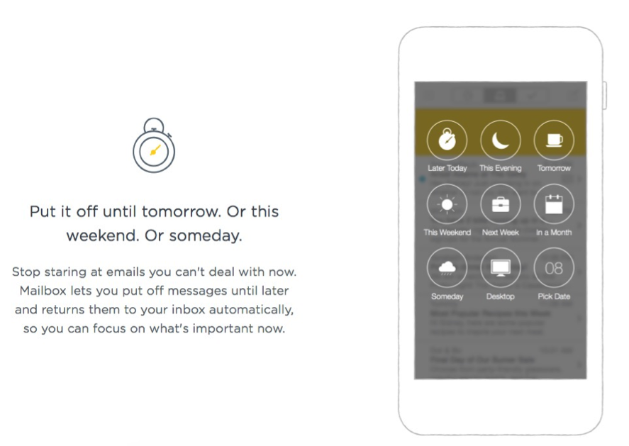 No podemos dejar de mencionar a Mailbox si necesitamos una aplicación para gestionar el correo. Creada en 2013 y adquirida a las pocas semanas por Dropbox.