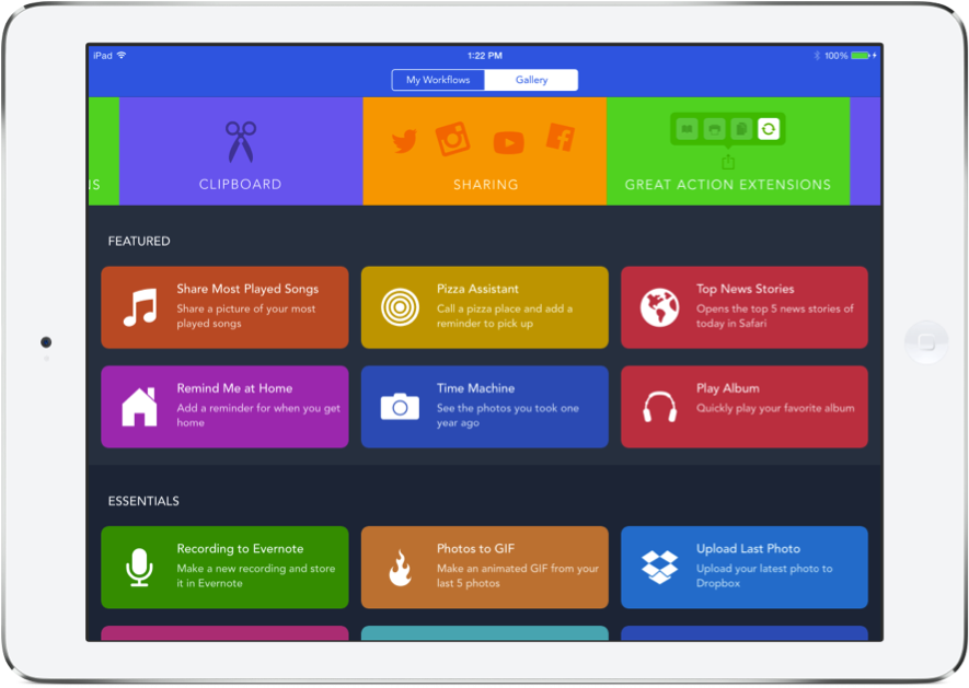 Workflow es una aplicación para automatizar nuestras tareas, podemos decirle que envíe las 10 últimas foros que saquemos a Dropbox o a un email. Creas tres fotos y le dices a Workflow que te haga un vídeo con textos.. y que lo envíe … Las posibilidades son infinitas y todo se hace de forma automática.