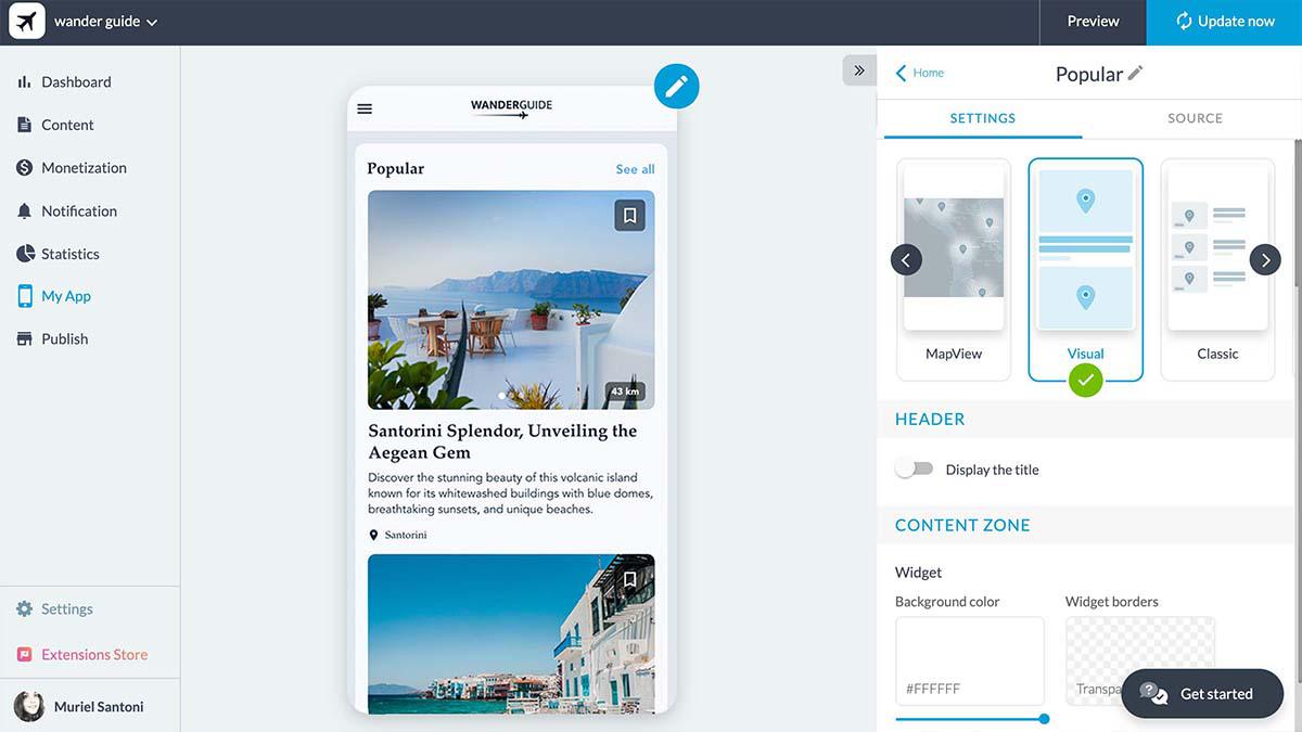 En tu panel de control, ve al menú My App > Estructura > Inicio. Luego, elige el widget de Lugares al que desea aplicar la plantilla Visual, o crea uno nuevo. Todo lo que queda es seleccionar la plantilla Visual y configurarla.