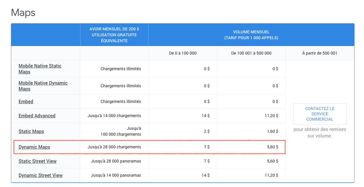 Para mostrar los mapas de su PWA, usamos la API de mapas dinámicos que ahora es una opción de pago. Como puede ver en la imagen de abajo, el precio se aplica al número de cargas de sus mapas. Google ya le ofrece un crédito mensual de $ 200 que equivale a 28,000 cargas. Más allá de eso, Google le cobrará $ 7 por 100,000 cargas adicionales.