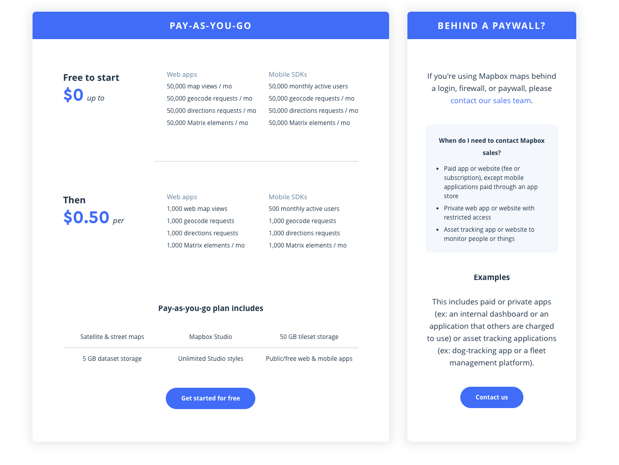 En cuanto a las tarifas, estamos hablando de vistas y no de carga y se ofrecen 50,000 por mes. Más allá de eso, MapBox te costará $ 0.50 por 1,000 vistas adicionales.