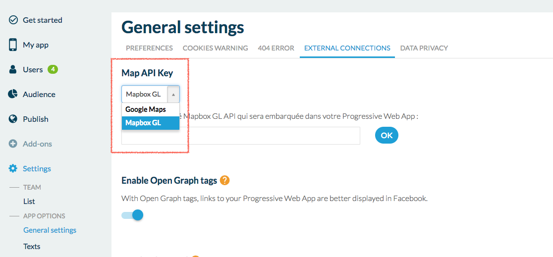 Una vez que haya seleccionado a su proveedor, deberá completar su clave de API y actualizar su PWA. Su proveedor de mapa se modificará para todas las mapas potencialmente presentes en su PWA, es decir: en la sección Lugares (mapa), en la sección Agenda (en los detalles de sus eventos), en el widget del mapa de “Home”.