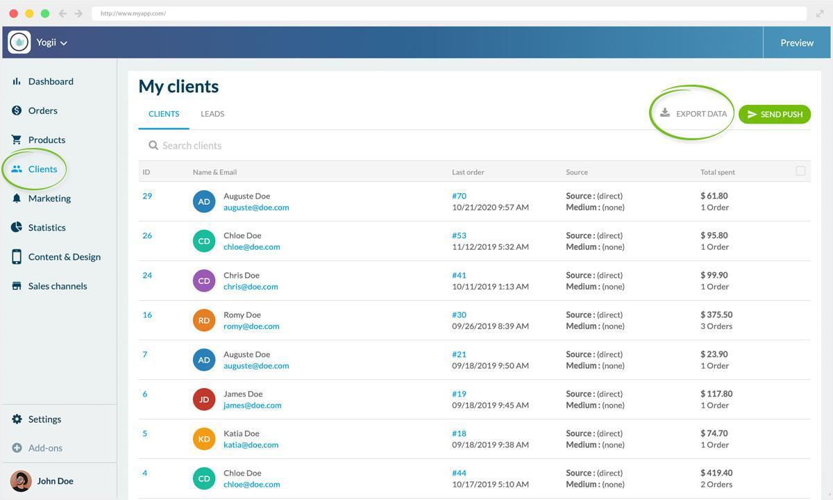 En el menú Clientes, ahora encontrarás un nuevo enlace en tu back office: Exportar datos.