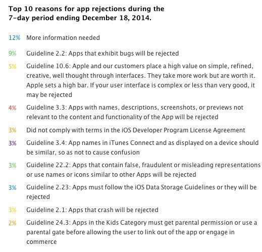 Si tu app ha de ser rechazada por Apple, un rechazo a causa de los meta-datos al menos es el mejor de los escenarios. Ello significa que la revisión se ha interrumpido y podrá retomarse en cuanto añadas la información que falta. En este caso, no habrás perdido tu plaza en la línea de revisión y no tendrás que subir un nuevo binario después de realizar las modificaciones.