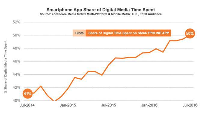 Un informe publicado por comScore revela que, en este julio 2016, las aplicaciones móviles representan el 50% del tiempo digital, en los Estados Unidos. Una cifra impresionante, donde las webs móviles sólo cuentan un 7% de la cuota total. En el mercado de las tablets, está más limitado, sólo con un 11% de tiempo pasando en éstas. Sin embargo, incluso con este porcentaje, las aplicaciones móviles continúan en cabeza (9% frente al 2% de las páginas webs antiguas). Si eres rápido con las matemáticas ya habrás calculado que el total del "tiempo digital" pasado en el ordenador de mesa es tan sólo del 32%.