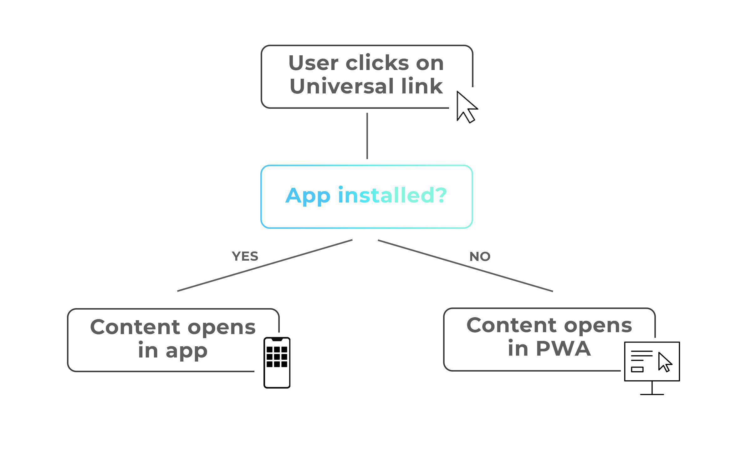 Por ejemplo, eres profesor de piano y tienes una aplicación para tus cursos online. Publicaste un anuncio en Facebook para promocionar el último video sobre cómo tocar una canción popular. Con el Universal Link, alguien que busca aprender esa canción hace clic en el enlace del anuncio y, aunque aún no tiene tu aplicación, inicia tu PWA y el usuario llega directamente al video exacto.