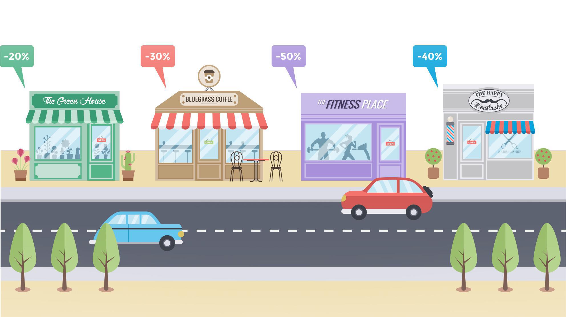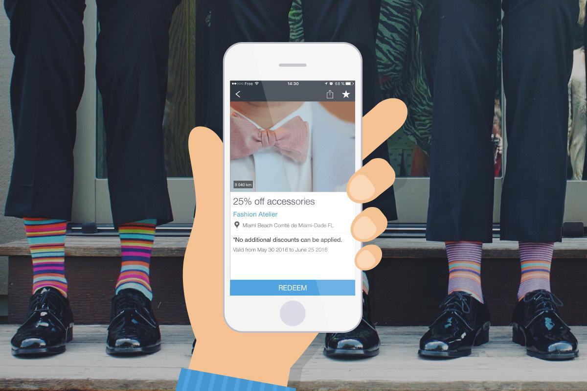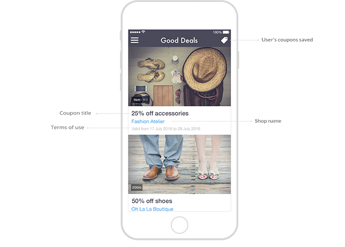 Como resultado, puedes imaginarte una app que reagrupa varias negocios locales y que ofrece cupones relacionados a diferentes categorías (uno por negocio). Cada cupón indicará la ubicación de la empresa asociada.