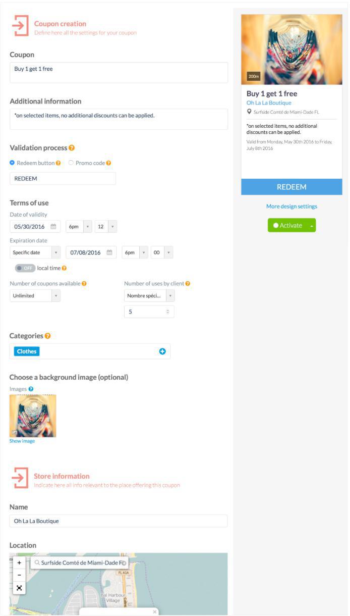 En tu back office, encontrarás una lista con todos los cupones, ésta puede ser ordenada por fecha de creación, disponibilidad o caducidad, asimismo, también se puede filtrar por categorías. Por último, pero no menos importante, también tendrás acceso a las estadísticas relacionadas con tus cupones (número de cupones canjeados, lista de clientes que han utilizado un cupón, etc ...).