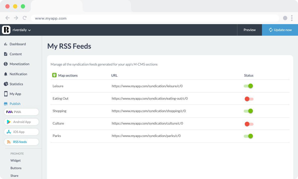 En el back office de tu app, desde la tienda de extensiones, busca la extensión RSS feed Map y pulsa en "Instalar". Esto creará automáticamente un nuevo menú "Mis fuentes RSS". En este nuevo menú, gestionarás todos los feeds de sindicación generados para las secciones M-CMS de tu app.