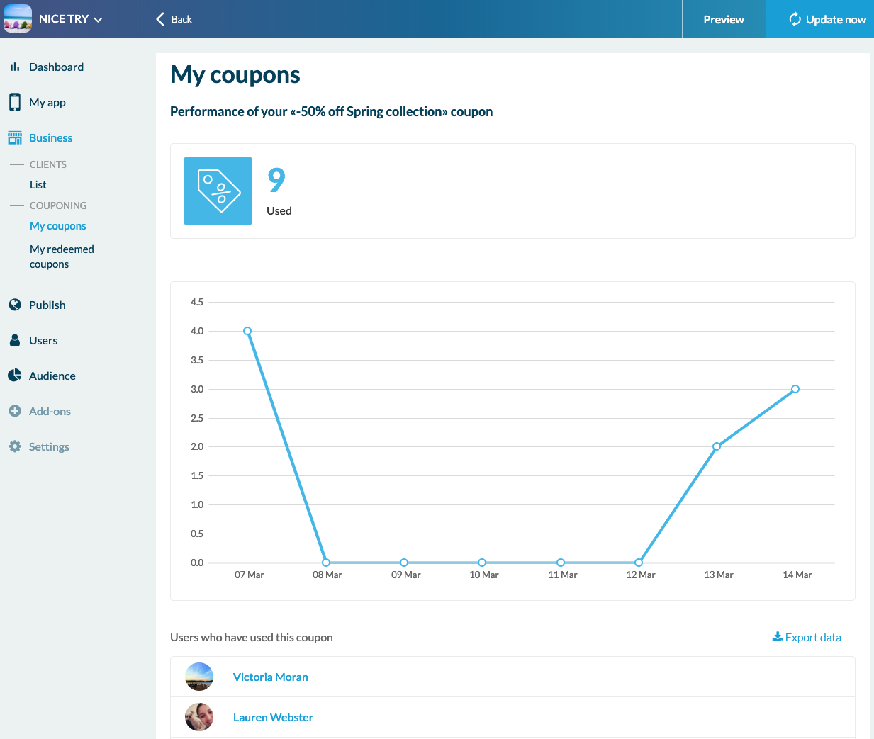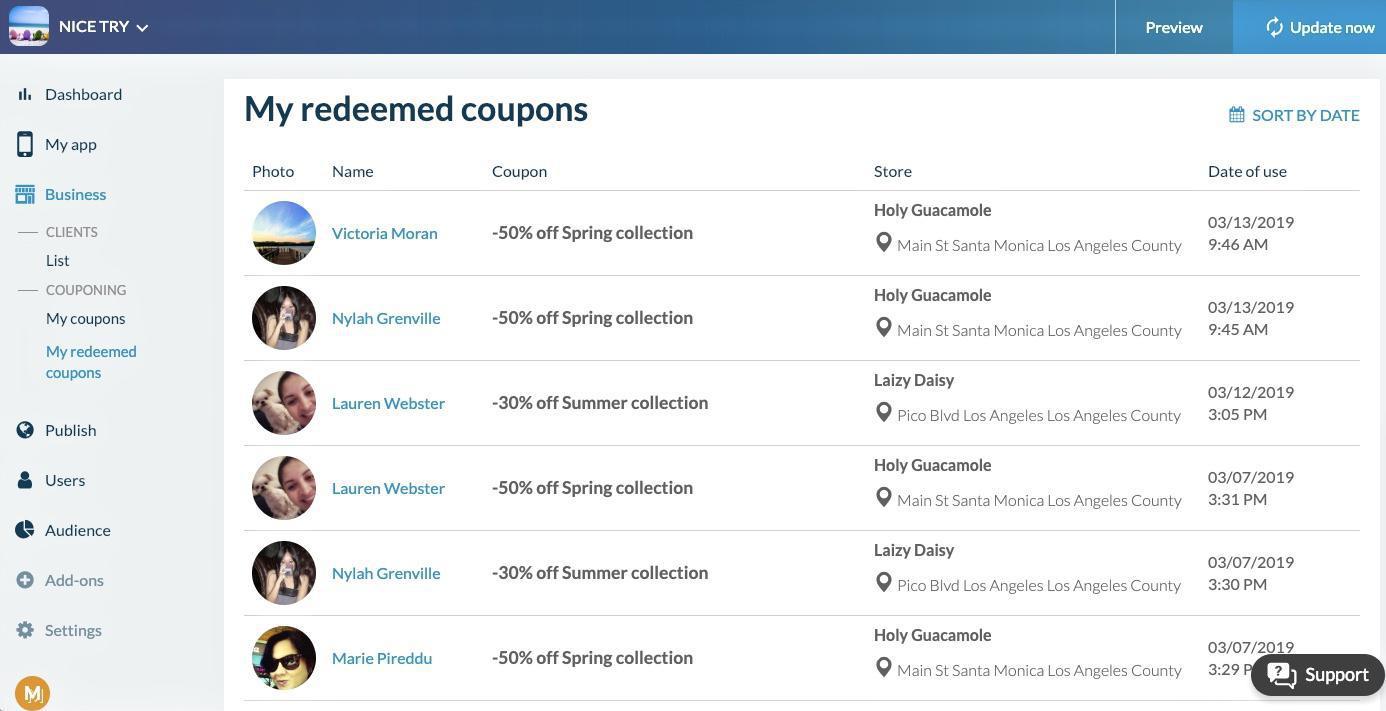 En el backend de su aplicación, Negocios> Cupones> Mis cupones