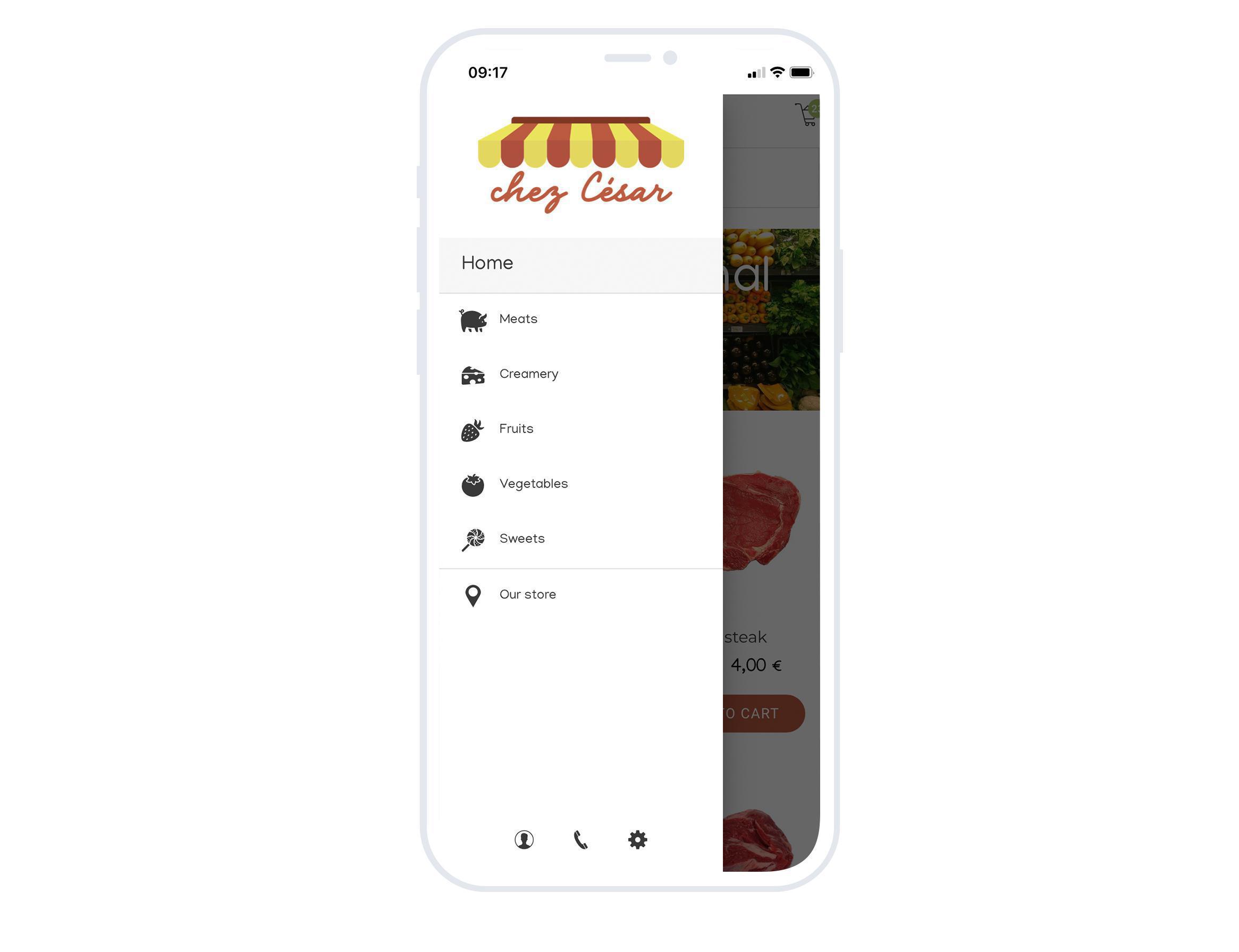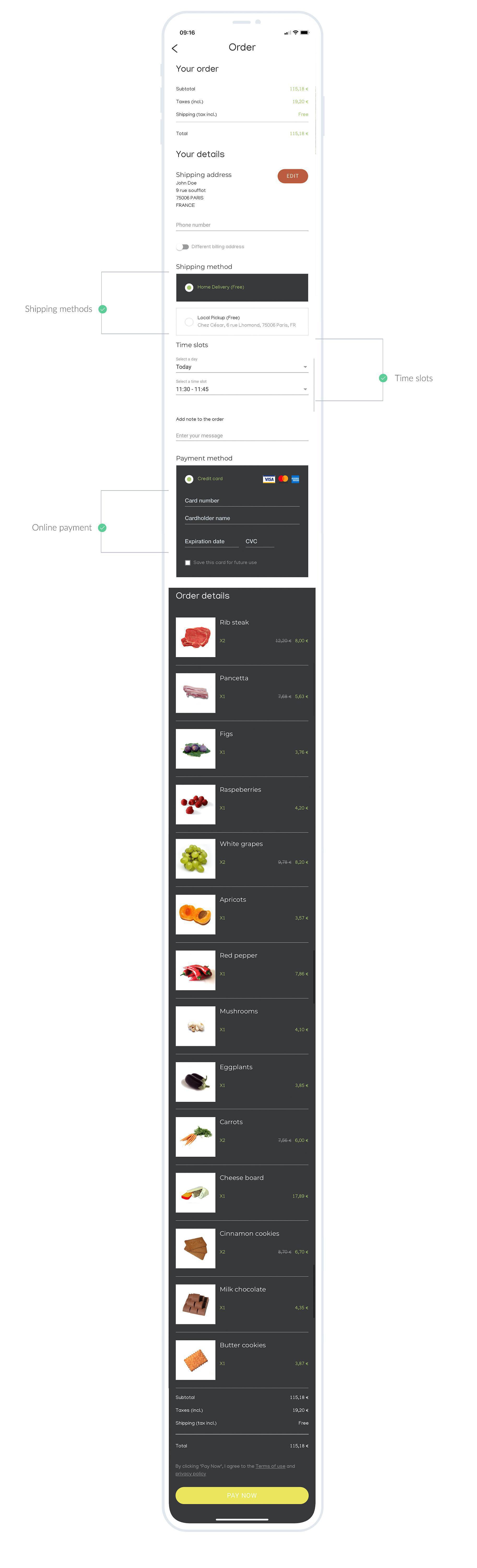 En el contexto de una tienda de comestibles local, ofrecer entrega local era una opción obvia. El gerente de Chez César prefirió limitar su servicio de entrega a un solo distrito parisino, para poder garantizar un servicio de calidad a su clientela fiel y no tener que perder demasiado tiempo en la entrega. En consecuencia, se ha configurado la entrega local en la aplicación, lo que le permite ofrecer un servicio seguro y rápido a sus clientes. Con este servicio de entrega local que cubre el área alrededor de la tienda de comestibles, los clientes del sexto distrito de París podrán seleccionar sus artículos rápidamente gracias al botón de compra rápida , pagar sus comestibles online y luego recibirlos en sus hogares durante la franja horaria de su elección.
