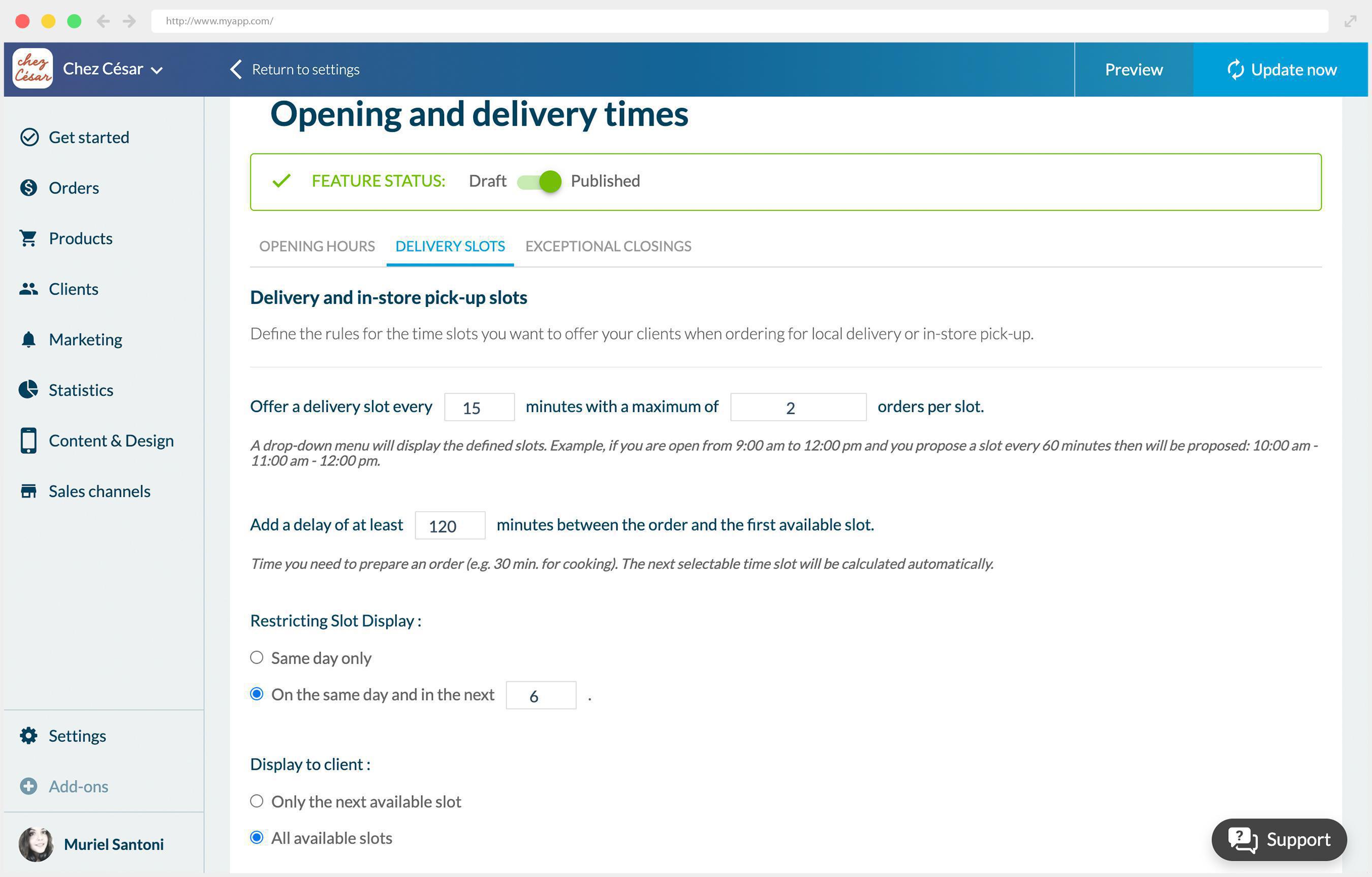 Para organizarse mejor y ofrecer aún más comodidad a sus clientes, el gerente de Chez César decidió activar la función Franjas Horarias. Le permite definir franjas horarias durante las cuales los clientes pueden elegir la hora a la que desean que se les entregue o recojan sus compras.