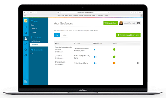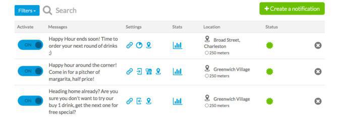 Una vez que hayas creado tu primera notificación, tendrás acceso a una lista de todas las notificaciones, su estado, el mensaje que contienen, los ajustes que se aplican y el Geofence al que están unidos.