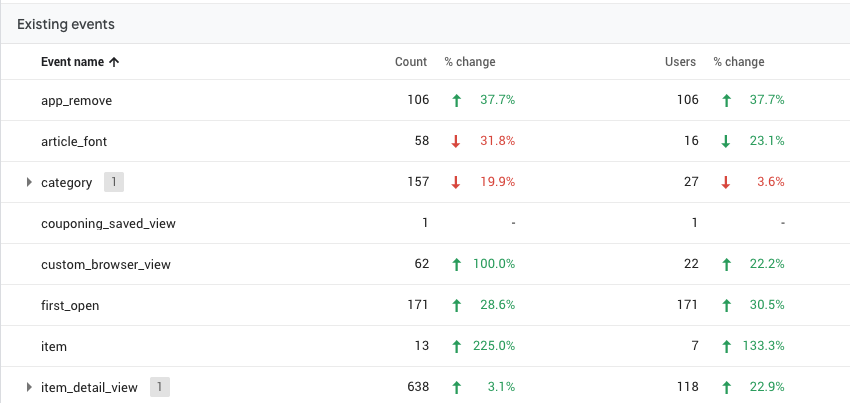 Firebase SDK registra automáticamente una serie de eventos predefinidos . Pero durante la implementación del SDK, el desarrollador (GoodBarber en este caso) puede definir otros eventos para recopilar. Por lo tanto, hemos agregado varios eventos clave, como ver una sección, una categoría, un artículo, el envío de un formulario, etc. Recolectar estos eventos y analizarlos te permite aprender más sobre cómo tus usuarios interactúan con tu aplicación.
