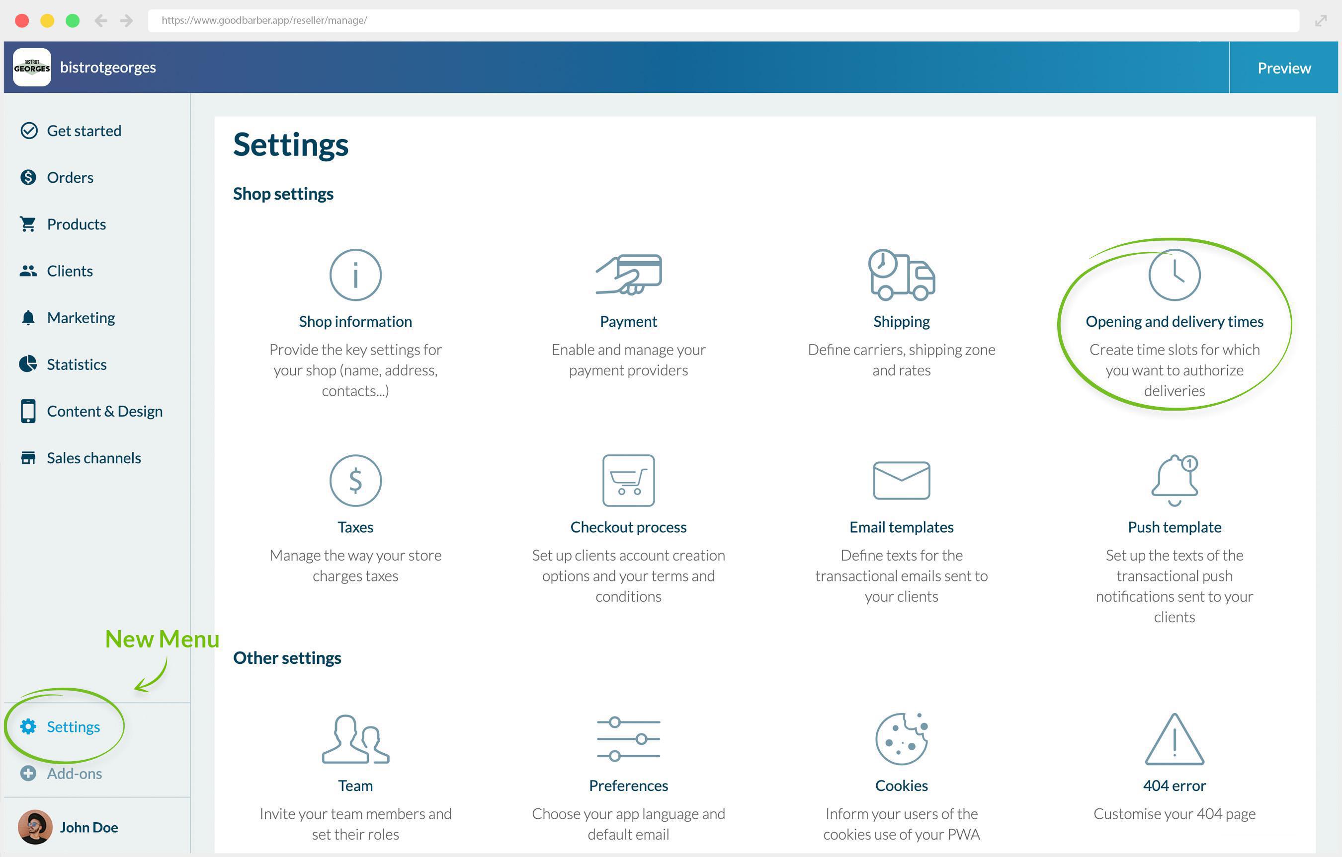Una vez que activa el add-on Franjas Horarias, aparecerá un nuevo menú Horarios de apertura y entrega en el menú en Ajustes.