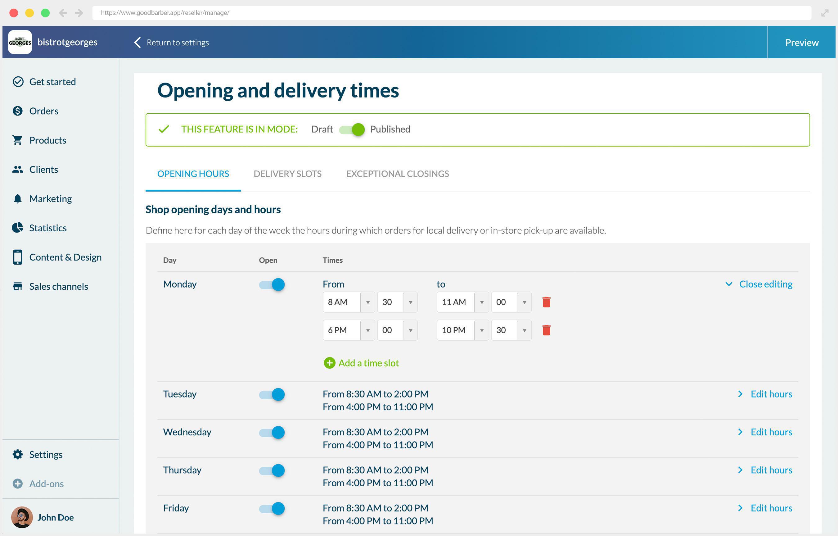 Puedes configurar todas las franjas horarias que se adapten a tu negocio. Por ejemplo, para un restaurante, puedes establecer horarios para el desayuno, el almuerzo y la cena y cerrar la entrega local durante el tiempo de inactividad para permitirte reabastecerte y prepararte entre los diferentes servicios.