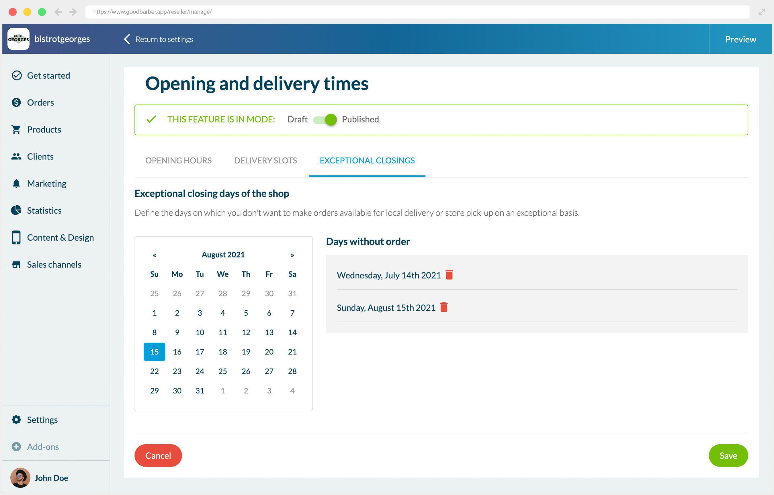 En esta última pestaña definirás cierres excepcionales como festivos, festivos nacionales, etc.