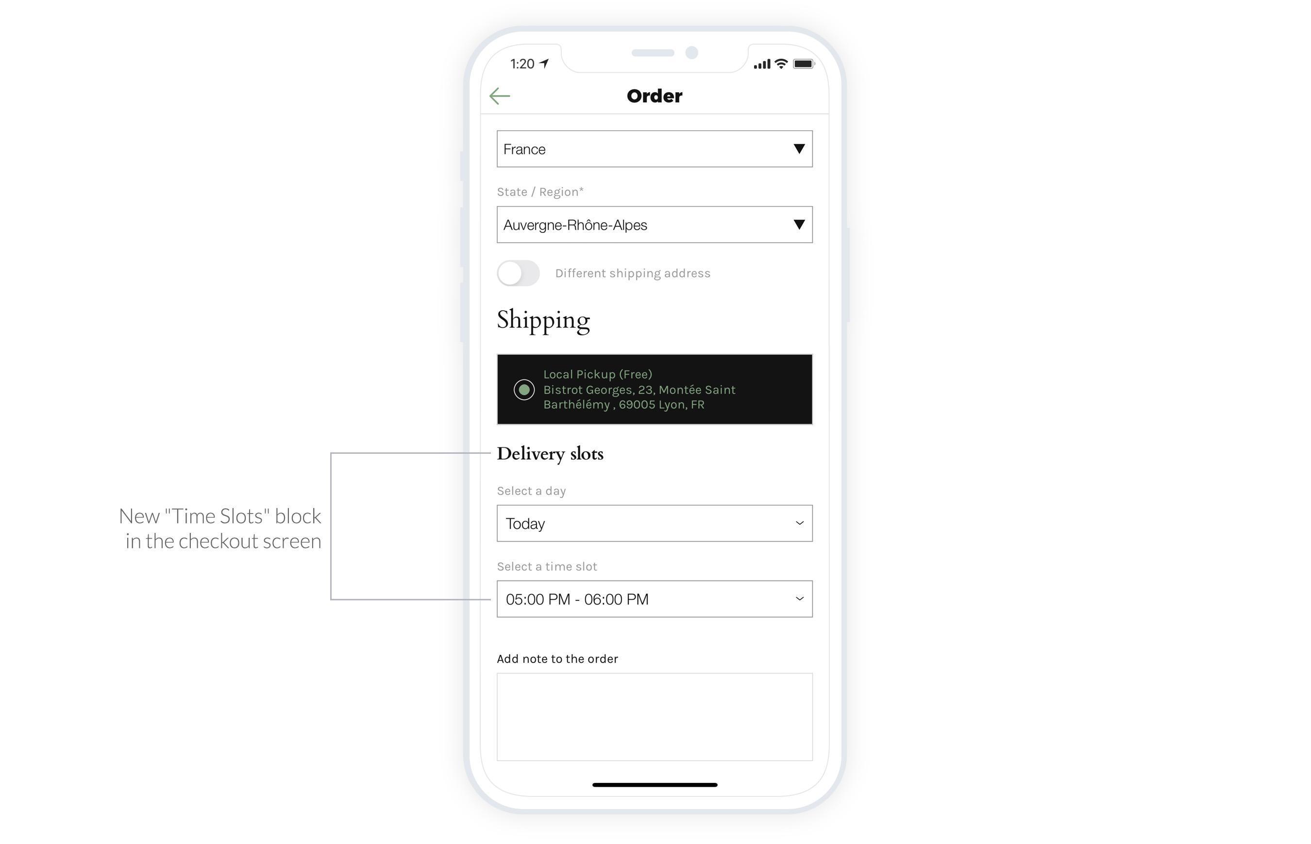 Cuando se activa el add-on de franjas horarias, si tu cliente elige la entrega local o la recogida en la tienda, se mostrará un nuevo bloque debajo del método de entrega elegido.