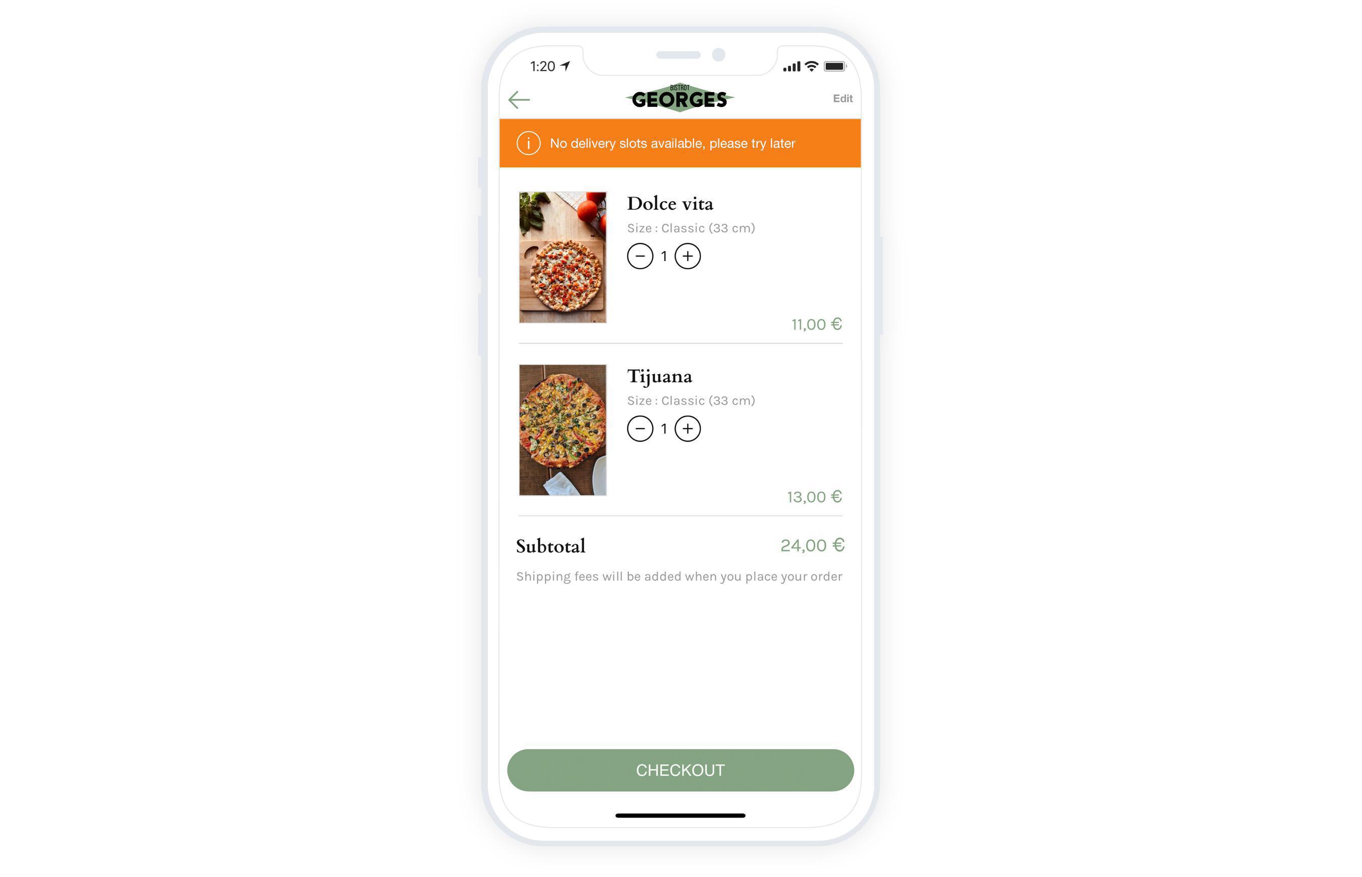 En caso de que tu cliente intente realizar un pedido y no haya franjas horarias disponibles (por ejemplo, solo muestras franjas horarias el mismo día y está intentando hacer un pedido para el día siguiente, o es un cierre excepcional) Se mostrará un banner de error y el cliente no podrá realizar el pago.