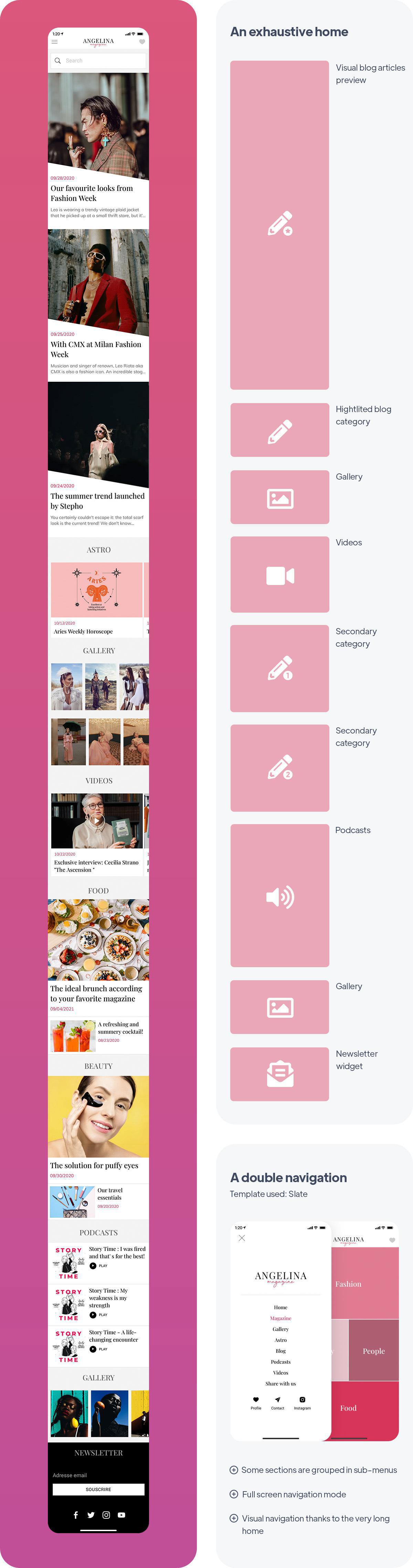 La elección de los colores se realizó en una paleta bastante neutra para resaltar el logo de la revista y permitir al lector sumergirse de inmediato en su universo. La página de inicio es muy larga, con una descripción general de cada sección y cada categoría de la revista. Además del widget de búsqueda, esto permite al lector tener una vista rápida y global del contenido nuevo que ofrece la revista, pero también encontrar contenido específico fácilmente. Las plantillas elegidas son muy visuales, lo que es una gran expectativa de los lectores de revistas de moda.