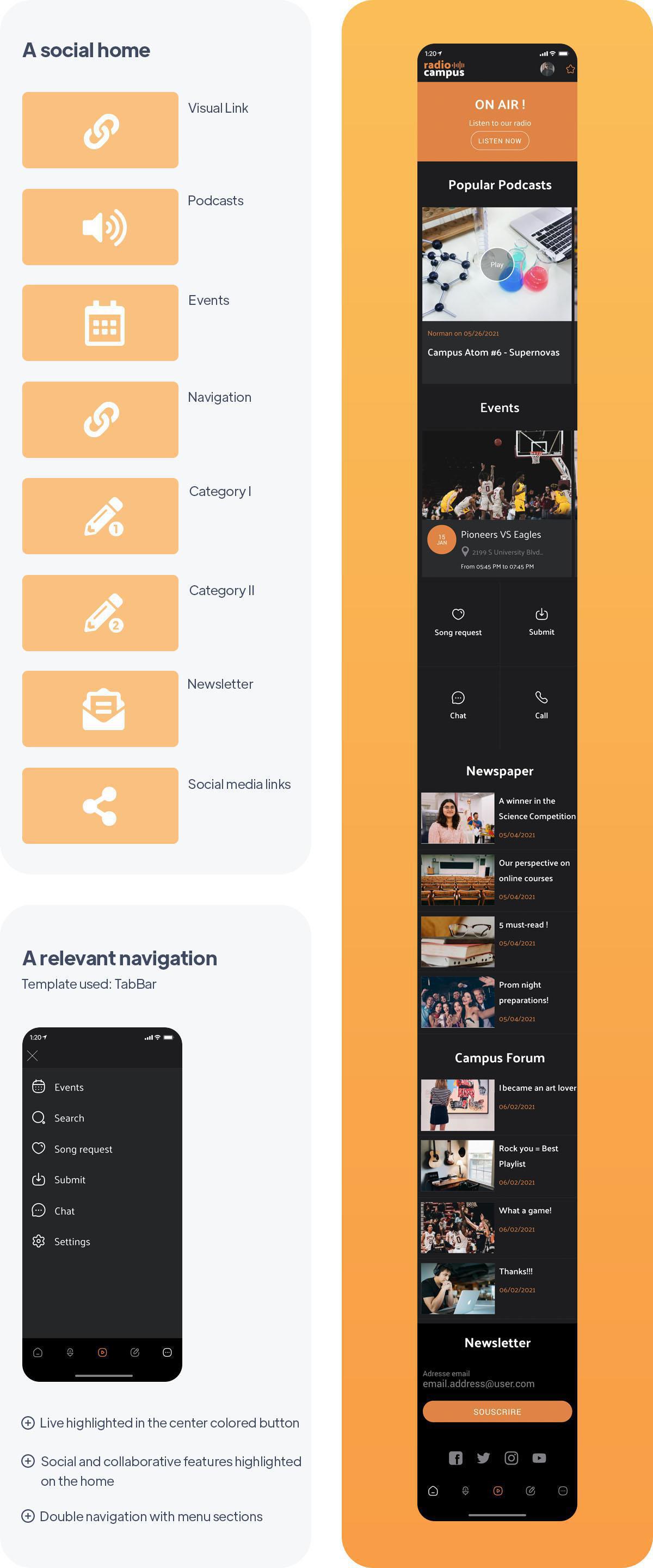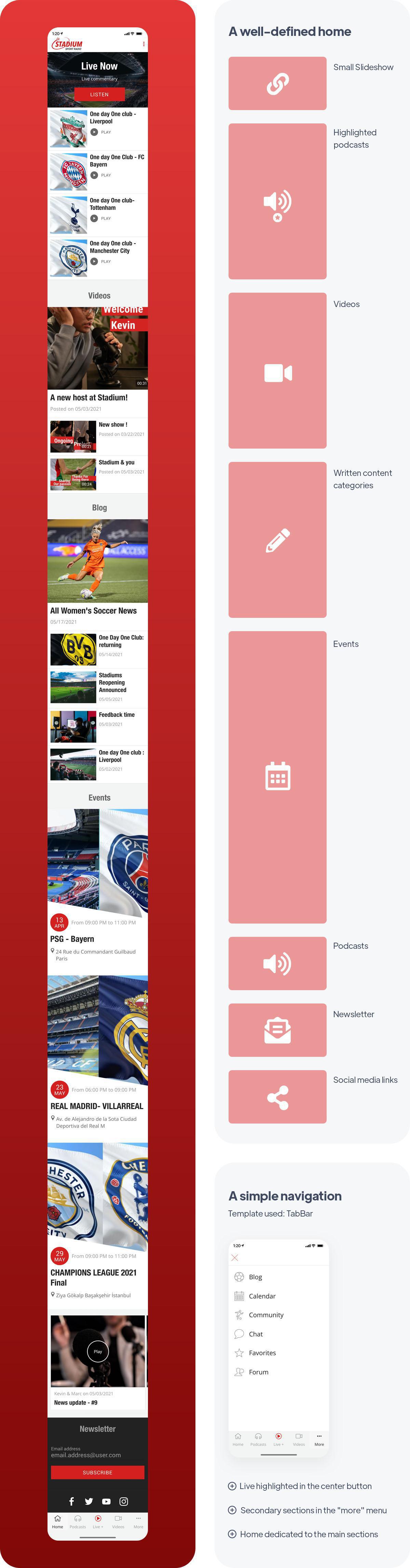 El inicio de esta aplicación se ha construido en torno a los contenidos principales: el Live y los podcasts. Se propone una gran llamada a la acción en la parte superior de la lista para invitar a los oyentes a escuchar la transmisión de radio en vivo de inmediato, con un botón central en el modo de navegación que les recuerda esta acción.