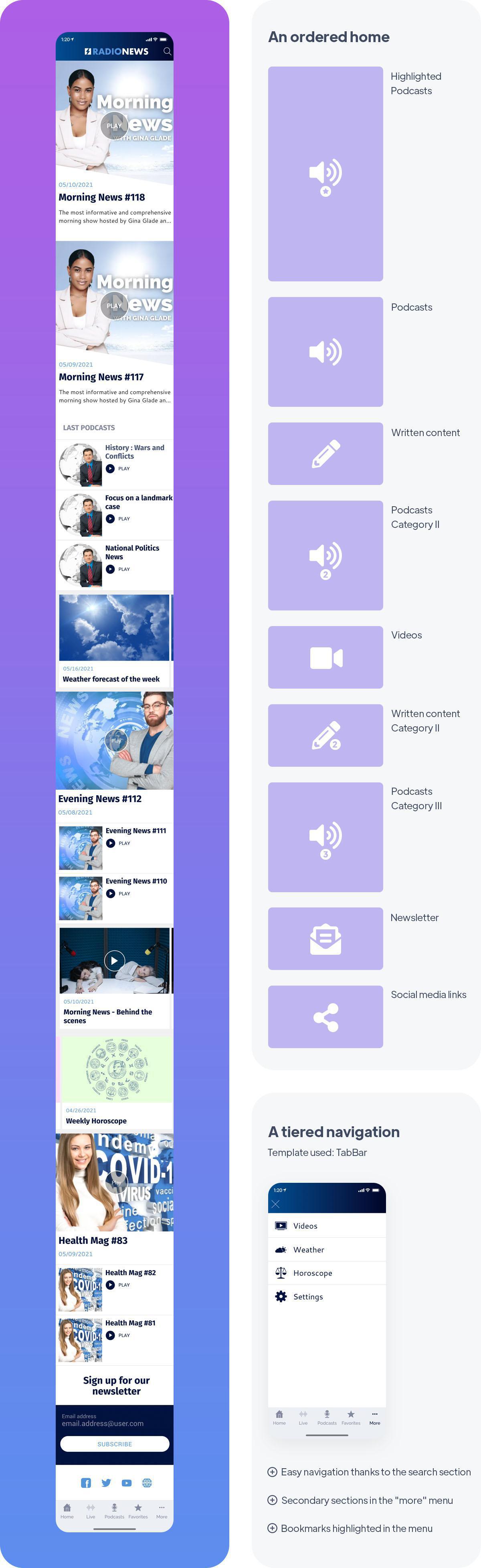 Con la aplicación Radio News nos acercamos a los objetivos de un periódico. De hecho, la vocación de esta radio es informar a sus oyentes sobre noticias frescas y generales. Por lo tanto, la aplicación debe poder informar a los oyentes de forma rápida y sencilla y debe presentar varios formatos de contenido. También es importante que la aplicación permita encontrar información fácilmente, por eso una función de búsqueda siempre está al alcance de cada oyente, en el encabezado de la aplicación. La página de inicio presenta casi todas las secciones de podcasts disponibles en la aplicación. También se puede encontrar contenido escrito adicional en la parte inferior de la página. Finalmente, la página de inicio termina con un módulo de boletín y enlaces a las redes sociales.