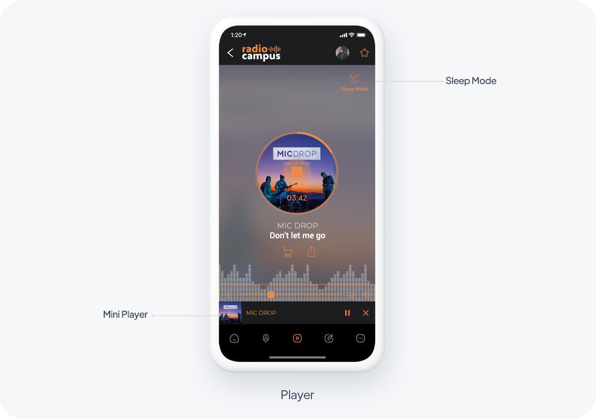 Tus oyentes pueden escuchar tu radio mientras navegan por otras secciones de tu aplicación. Se muestra un mini reproductor en todas las secciones de la aplicación para permitir que tus oyentes controlen la reproducción.