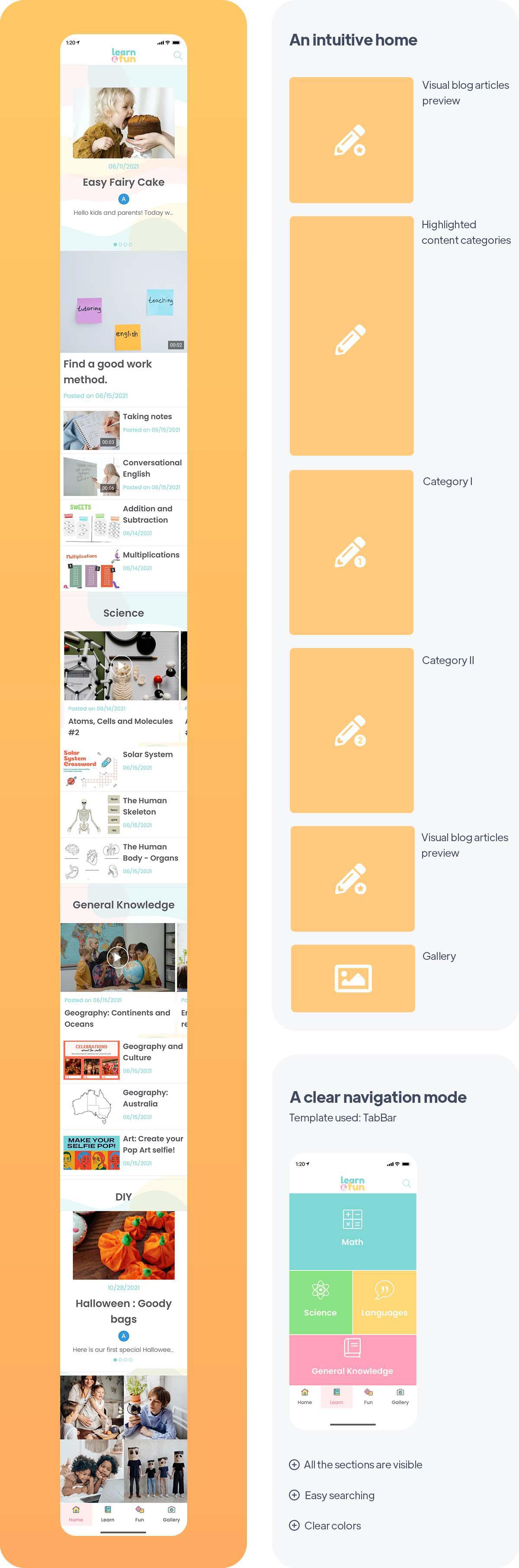 La elección de la barra de navegación se hizo a favor de una TabBar, visible y accesible en todo momento. Permite un fácil acceso a los contenidos ofrecidos gracias a los menús en los que se organizan los diferentes cursos. Estos menús son muy intuitivos y todo el diseño de la aplicación está pensado para los niños: suave y colorido, atractivo, claro e ilustrado con iconos que facilitan la comprensión de los más pequeños.