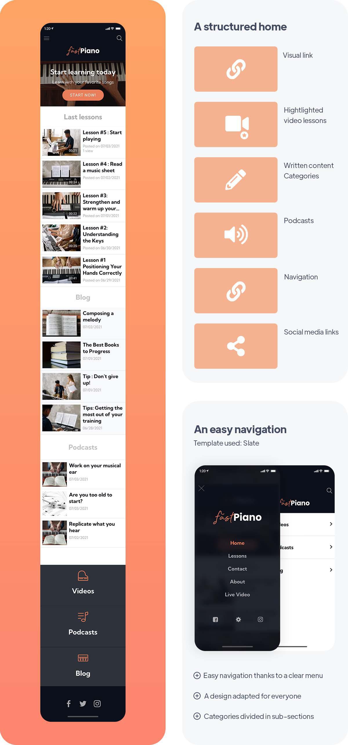 The Home es minimalista. El objetivo principal de esta aplicación es proponer varios tipos de contenido para diversificar los métodos. Se utilizan diferentes medios: contenido en video a través de tutoriales, así como lecciones en vivo, podcasts y artículos escritos en la sección del blog. De esa manera, todos pueden ir a su tipo de contenido favorito y encontrar una experiencia de aprendizaje adaptada.