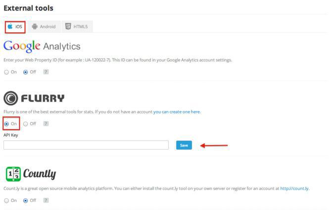 Selecciona la página de la derecha, dependiendo de la plataforma, haga clic en "ON" y a continuación pega la Api Key de Flurry. Obviamente, haz clic en "Guardar"