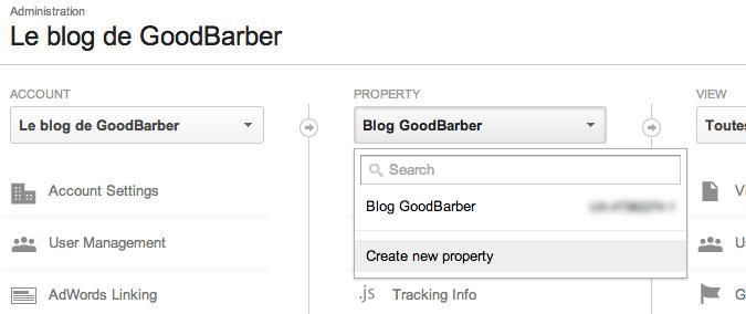 Puede crear esta dentro de una cuenta existente, pero no se puede utilizar la misma que has utilizado en tu sitio web. Haz clic en la lista de propiedades y selecciona "Crear nueva propiedad".