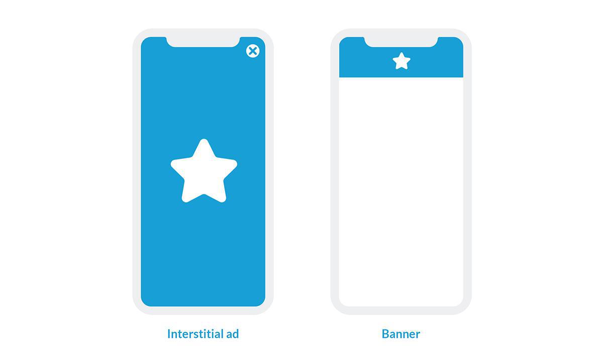 - Intersticial: Es un anuncio de pantalla completa. Los anuncios intersticios no se visualizan cada vez que el usuario realiza una acción. 3 acciones entre la pagina de lista/widget y una pagina de ítem son necesarios para visualizar los anuncios Intersticios.