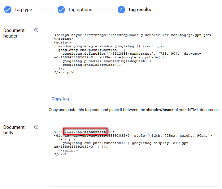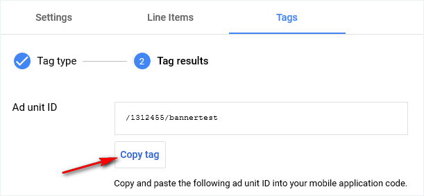 Luego haz clic en continuar hasta el paso "Resultados de etiquetas" y podrás recuperar el Ad unit ID para tu aplicación móvil.