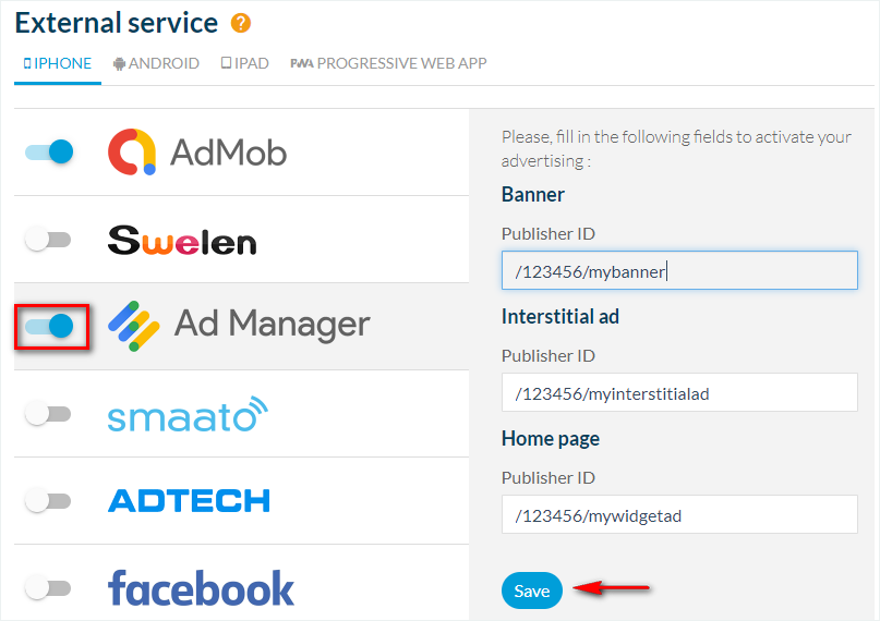 En Marketing> Monetización> Servicios externos, selecciona la plataforma donde desea mostrar anuncios (iPhone, Android, iPad, PWA).