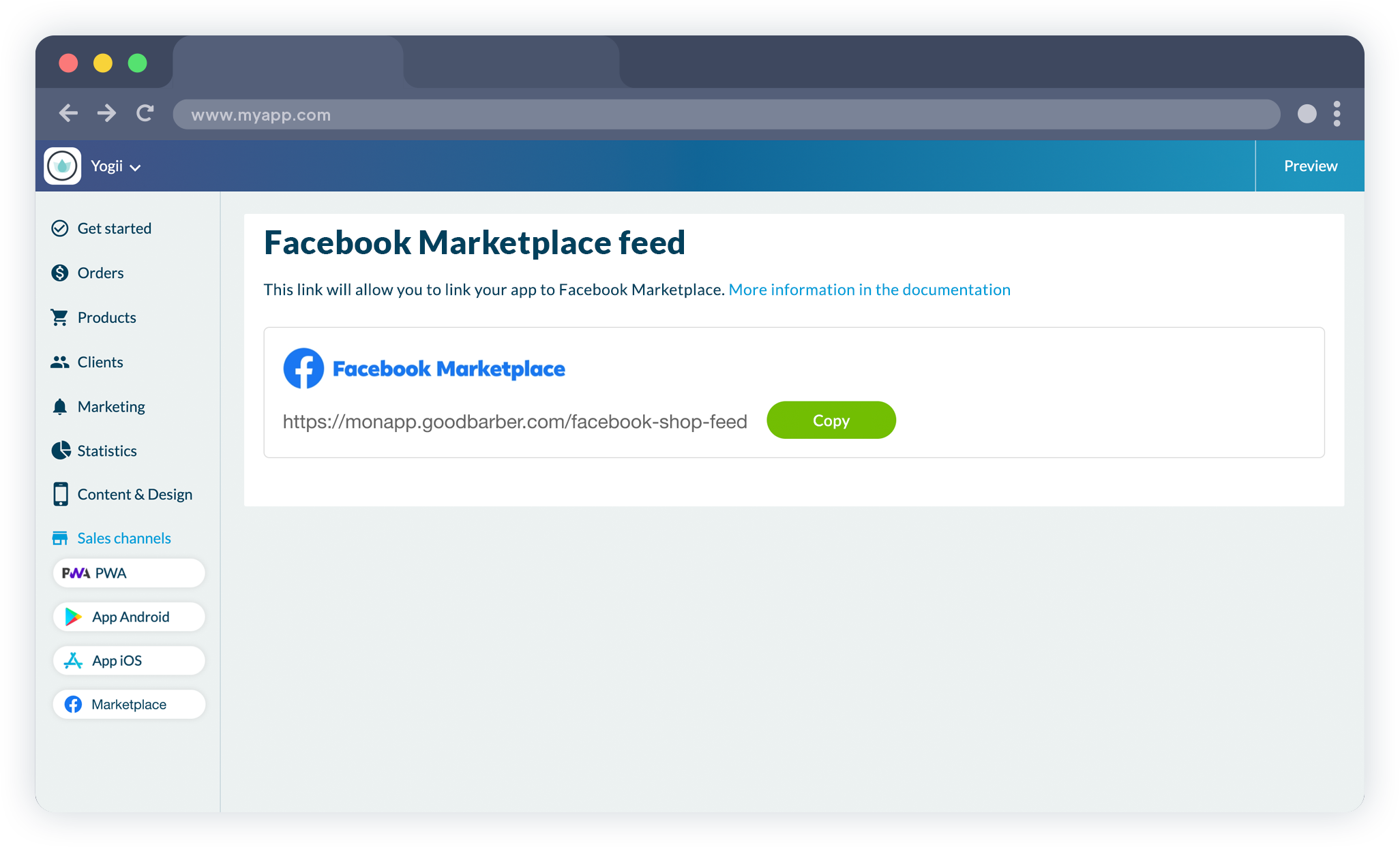 - En tu back office de GoodBarber, instala la extensión Marketplace . Esto agregará una nueva sección en el menú del Canal de ventas en el lado izquierdo de tu tablero. Luego conecta tu GoodBarber y Facebook simplemente ingresando la URL provista en la interfaz de tu tienda de Facebook.