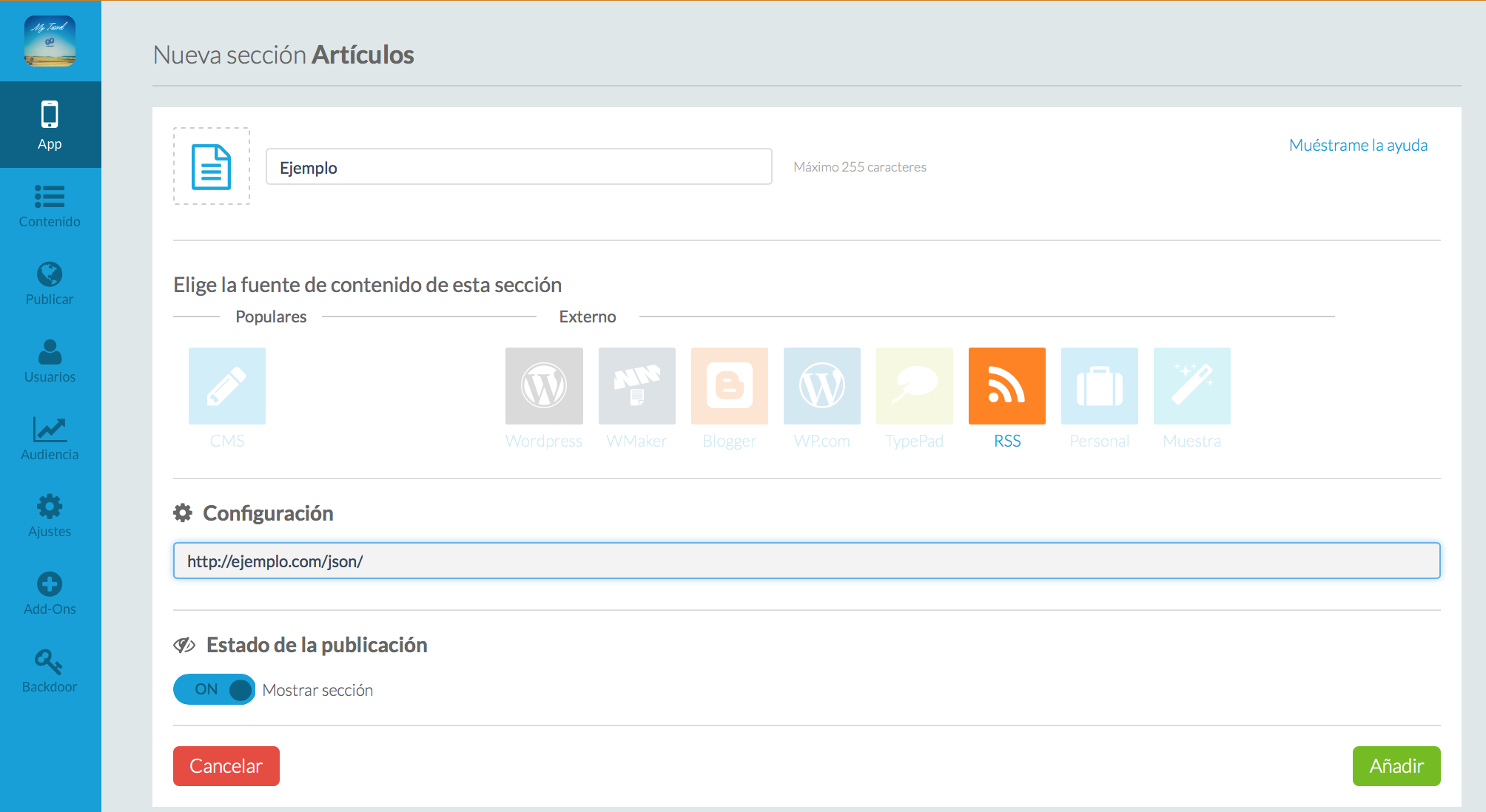 Si tienes una web creada con Joomla, puedes usar el conector RSS, pero, este conector te impedirá acceder a algunas de las mejores características de tu app, como: comentariosdelospost, búsquedadecontenido, estrella de favoritos, etc.