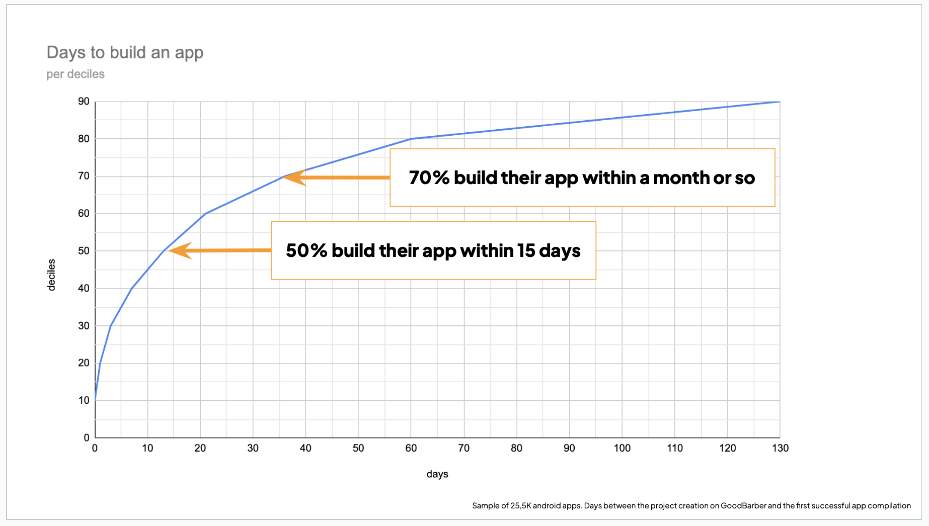 Hemos realizado un estudio sobre la velocidad de creación de apps. Este estudio muestra que para la mitad de los usuarios de GoodBarber, se tarda menos de 15 días desde el momento en que crean su proyecto hasta la primera compilación de la aplicación. Esto ilustra lo rápido que se puede diseñar una aplicación móvil utilizando un app builder.