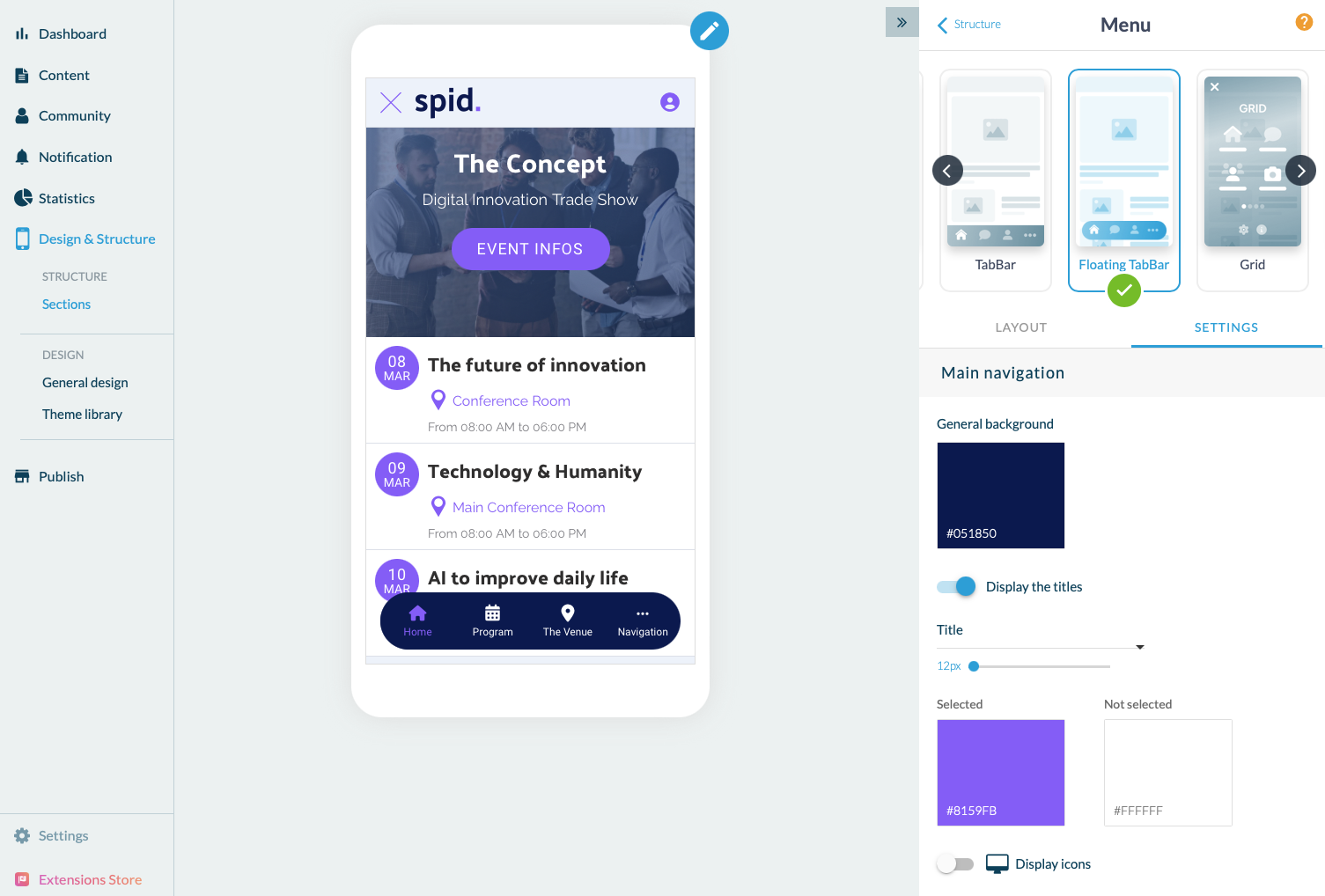 En el back office de su aplicación, vaya al menú Estructura y diseño > Estructura > Secciones > y haga clic en la sección Menú. Se abrirá el panel de edición del menú de navegación. Selecciona la plantilla Floating tabBar y personalízala a tu gusto.