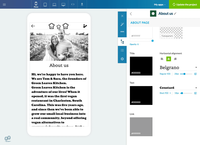 Cada uno de los textos se muestra con la misma fuente dentro de la app y del Constructor. Tanto la previsualización de la app como el panel de creación tienen la misma fuente, de ese modo la gestión de las fuentes es más clara.