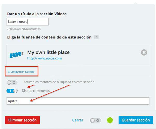En las opciones avanzadas de la sección, activar la opción Disqus comments y copiar vuestro short name.