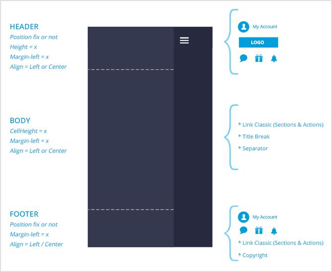 Little Swipe: este menú es ideal para introducir una navegación secundaria discreta, en formato icono, con una organización vertical. Por defecto, está escondido y se abre desde la parte izquierda de la pantalla, ocupando muy poco espacio. Es desktop, es posible forzar su visualización permanente en Little Swipe.