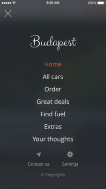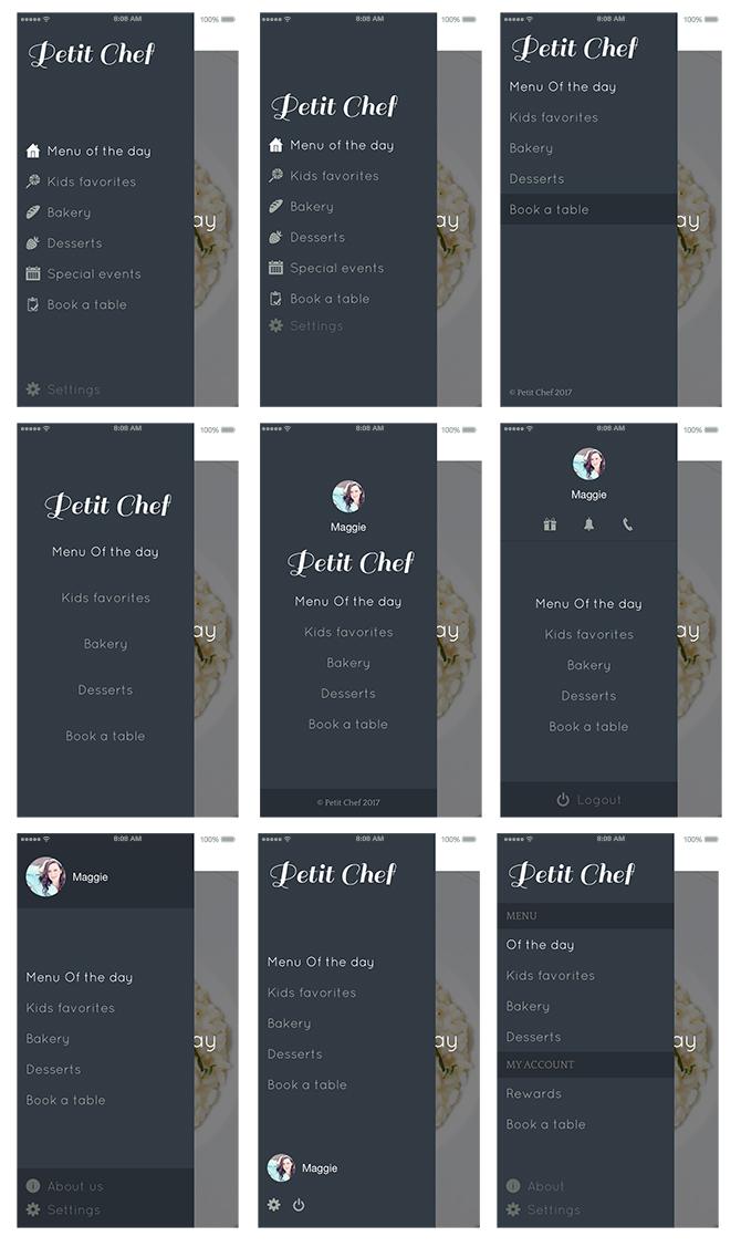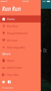 Slate: esta navegación está escondida pero disponible tanto desde la izquierda como desde el centro de la página, en base a la configuración seleccionada. Las entradas son sólo texto y se muestran en formato lista. Es posible hacer que el menú se muestre al abrir la app.