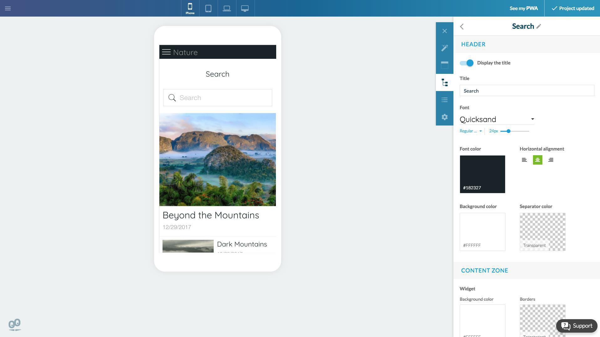 Además de los widgets de contenido y de navegación, es ahora posible añadir un widget Búsqueda. Asi, permite a tus usuarios buscar contenido directamente al entrar en la aplicación.