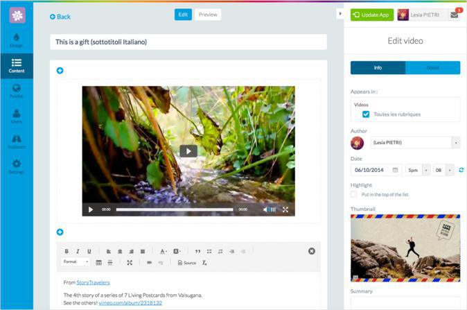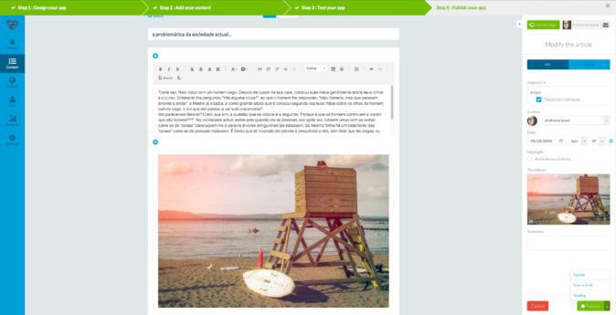 Si deseas crear una aplicación que exija la integración de diversos formatos, como textos, fotos y vídeos. Sólo tienes que añadir una sección de artículos CMS y divertirte creando tus posts! También, como en todas las secciones CMS, tienes la posibilidad de publicar de inmediato, guardar la sección como borrador o dejarla en pendiente. Esto es útil cuando no quieres perder el contenido pero todavía te falta información y la quieres añadir más tarde (Guardar como borrador) o si has completado la publicación, pero deseas publicarla en una fecha específica (Pendiente).