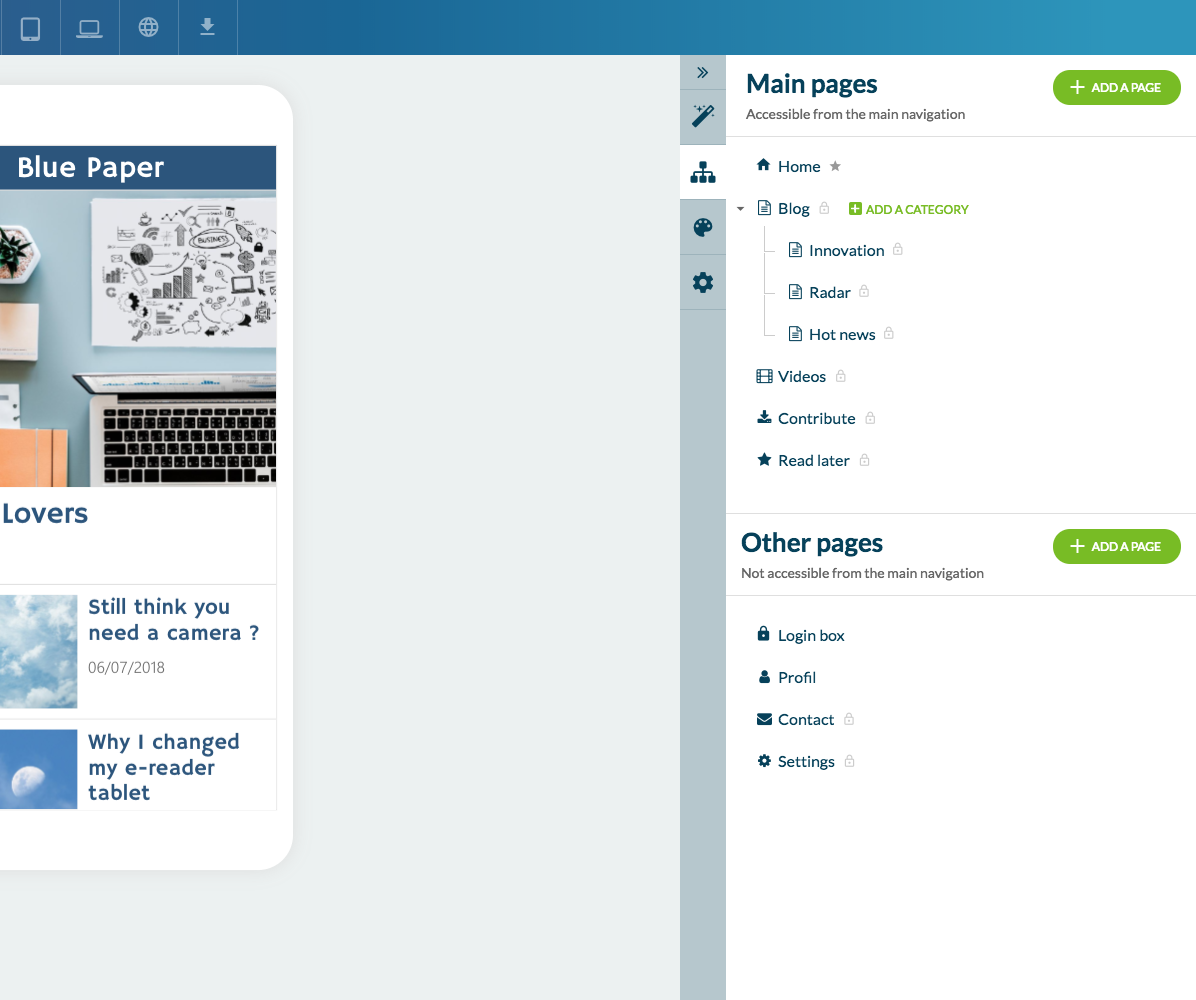 Esta distinción tendrá un impacto sobre tu modo de navegación. De hecho, las Páginas Principales son en realidad las páginas que quieres mostrar en tu modo de navegación. Las Otras Páginas, en cuanto a ellas, quedarán asequibles, pero no se mostrarán en el modo de navegación. Este principio es útil por ejemplo si deseas proponer entradas hacia páginas únicamente a través de la Home de tu app.