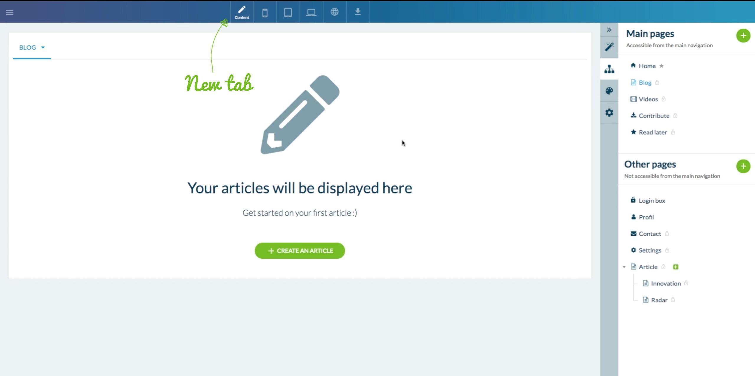 Una vez la página seleccionada, una nueva pestaña aparece en la parte superior de la pantalla. Es el modo de edición que te permite crear y gestionar tu contenido, en pantalla completa. Sólo tienes que que hacer clic sobre el botón de acción “Añadir un artículo”.