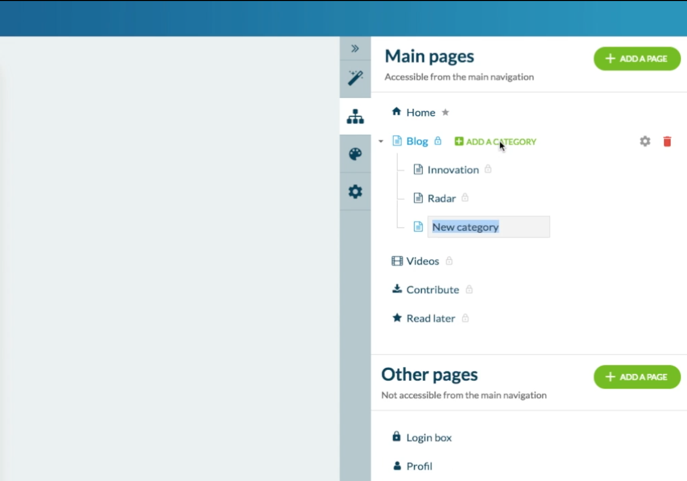 Los ítems de tus Páginas de Contenido pueden estar clasificadas en categorías. Para crearlas, sólo hay que sobrevolar la página en cuestión en el panel de izquierda. Si la opción de categoría está disponible, aparecerá una mención “Añadir una categoría” que te permite crear tus diferentes categorías directamente en el panel.