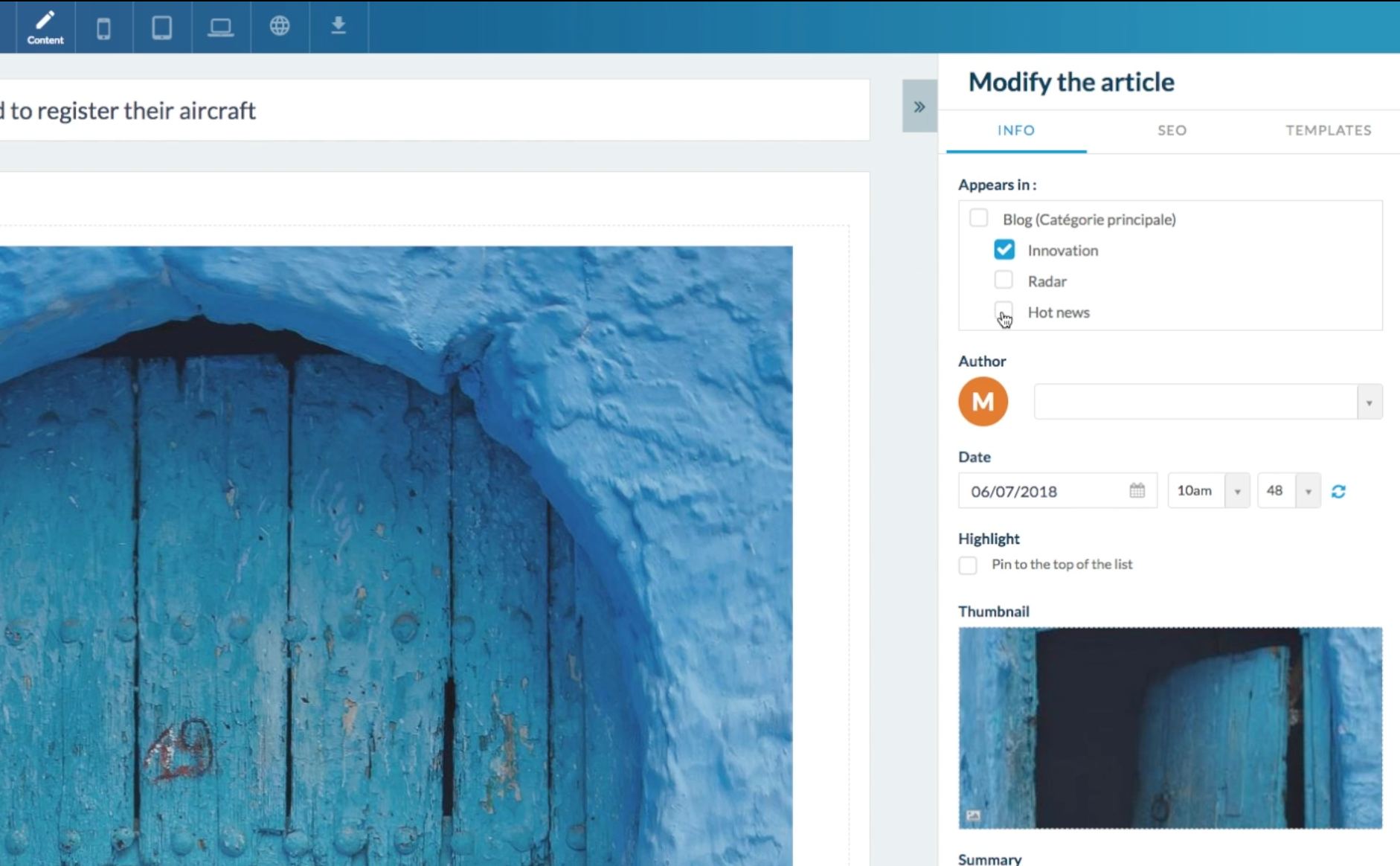 - La pestaña Info te permite seleccionar las opciones de publicación: la página y la categoría vinculadas al artículo, el autor, la fecha de publicación, la miniatura del artículo, o incluso su resumen, que aparecerá en la lista de artículos.