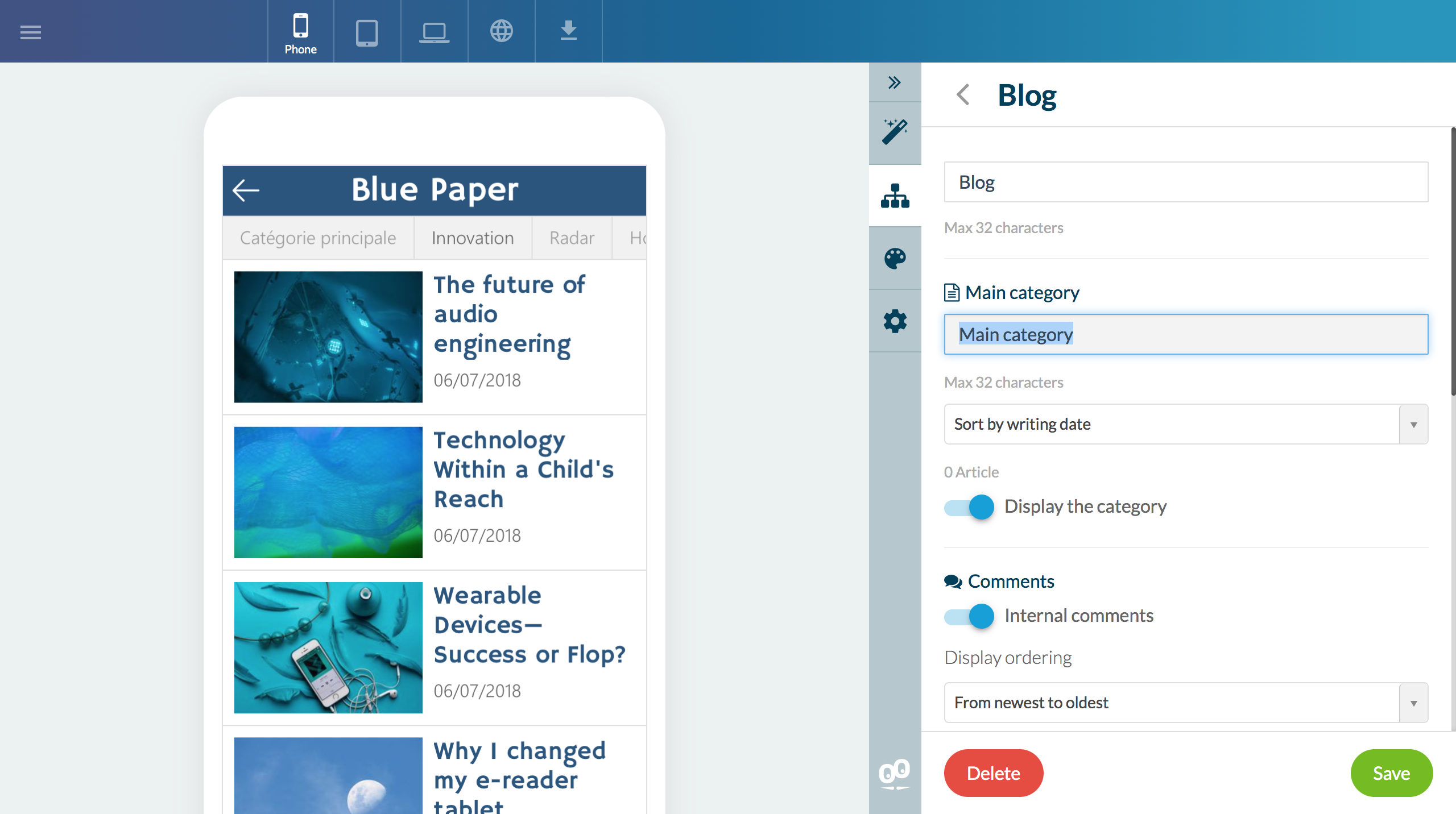 Ahora, la gestión de tu contenido se hace a partir de un menú totalmente dedicado. Así, la estructura de tu app se visualiza inmediatamente cuando llegas en el menú Contenido. El panel te permite tener una vista global sobre la organización de tus páginas.